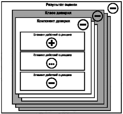 Общий вердикт положительный тогда и только тогда, когда все составляющие вердикта положительные. В примере, показанном на рисунке 2, вердикт для одного из элементов действий оценщика отрицательный, поэтому вердикты для соответствующего компонента доверия, класса доверия и общий вердикт также отрицательные.