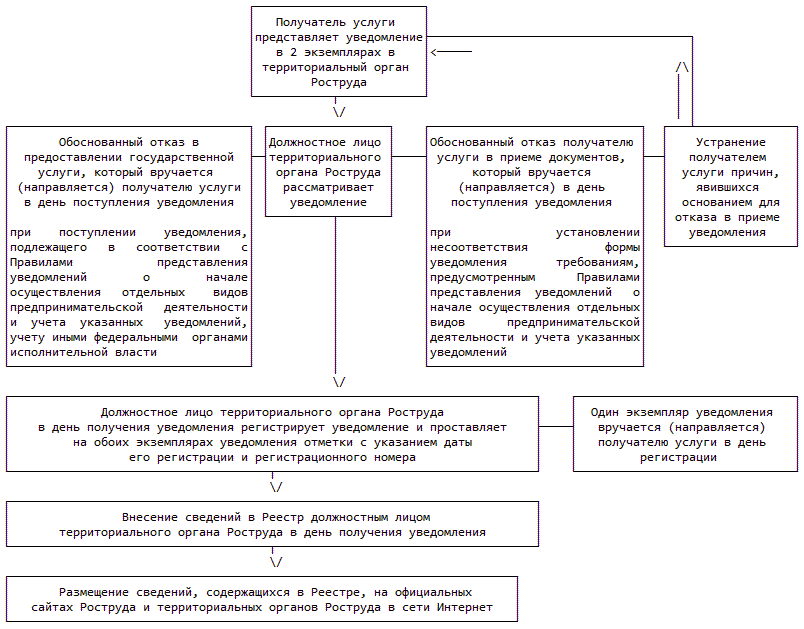 БЛОК-СХЕМА ПРЕДОСТАВЛЕНИЯ ТЕРРИТОРИАЛЬНЫМ ОРГАНОМ РОСТРУДА ГОСУДАРСТВЕННОЙ УСЛУГИ ПО ПРИЕМУ И УЧЕТУ УВЕДОМЛЕНИЯ О НАЧАЛЕ ОСУЩЕСТВЛЕНИЯ ОТДЕЛЬНЫХ ВИДОВ ПРЕДПРИНИМАТЕЛЬСКОЙ ДЕЯТЕЛЬНОСТИ