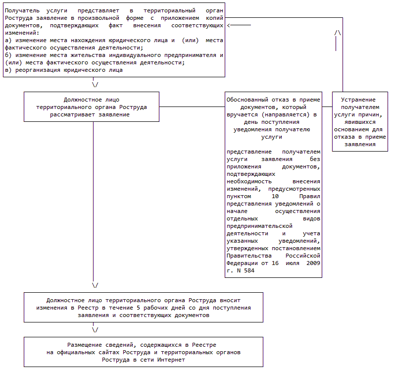 При получении информации от получателя услуги в письменной форме или в форме электронного документа об изменении его места нахождения и (или) места фактического осуществления его деятельности, изменении места жительства индивидуального предпринимателя и (или) места фактического осуществления его деятельности, реорганизации юридического лица должностное лицо территориального органа Роструда, ответственное за учет поступивших уведомлений, вносит сведения в Реестр в течение 5 рабочих дней со дня поступления соответствующих документов в территориальный орган Роструда.