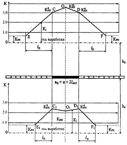 зона повышенного горного давления (далее - ПГД) - часть угольного массива и боковых пород, испытывающая повышенные напряжения, передаваемые краевыми частями, отдельными оставленными целиками или другими концентраторами, расположенными на смежном пласте (пластах);