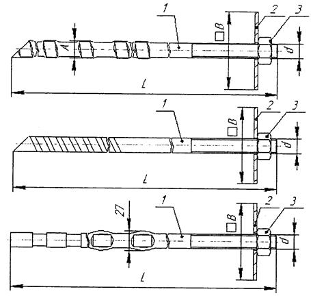 Рис. 5. Сталеполимерные анкеры из прокатов винтового профиля N 16, 20, 25 (А16В, АМК АВ16, А20В, АМК АВ20, А25В, АМК АВ25, АК20В, АКВ) 1 - стержень анкера; 2 - гайка; 3 - шайба опорная. Материал стержня - Ав400С