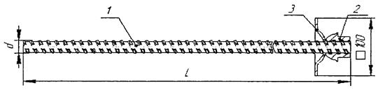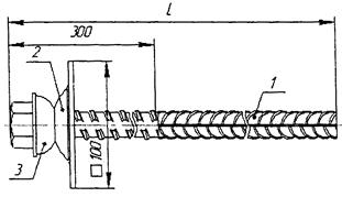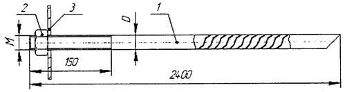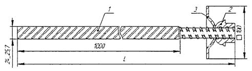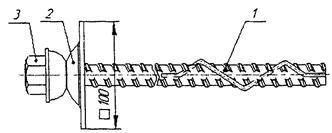 Рис. 3. Сталеполимерный анкер АК-22 (АКМ АМ) из проката периодического профиля. 1 - стержень анкера; 2 - шайба опорная; 3 - гайка. Материал стержня - А400С
