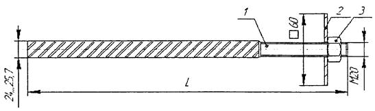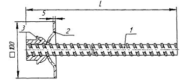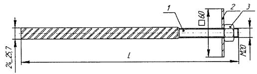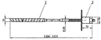 Рис. 7. Сталеполимерный анкер со сварными стержнями. 1 - стержень анкера сварной, 2 - гайка, 3 - шайба опорная. Стержень из арматуры винтового профиля N 20 сварен встык со стержнем арматурным из периодического профиля N 22. Материал стержня - Ав400С