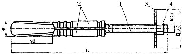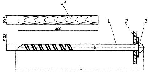 Рис. 14. Сталеорганический анкер. 1 - стержень анкера; 2 - опорная плитка, 3 - опорная шайба; 4 - деревянная втулка. Разрывное усилие - 95 кН. Допускаемая нагрузка - 70 кН. Марка стали - Ст. 3. Масса 1 м анкера - 2,8 кг