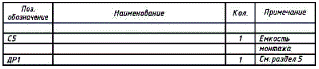 4 Если в изделии имеются элементы, не являющиеся самостоятельными конструкциями, то при записи их в перечень графу "Наименование" не заполняют, а в графе "Примечание" помещают поясняющую надпись или ссылку на поясняющую надпись на поле схемы (см. рисунок 7).