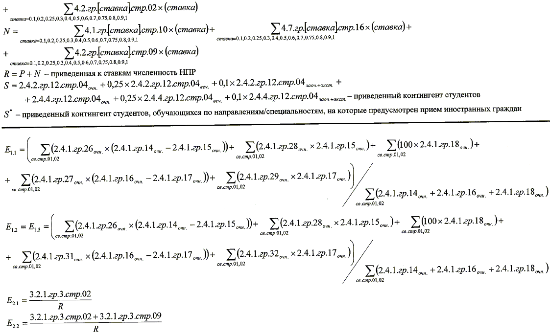 | Е1.1 | Средний балл единого государственного экзамена (далее ЕГЭ) студентов, принятых по результатам ЕГЭ на обучение по очной форме по программам бакалавриата и специалитета за счет средств соответствующих бюджетов бюджетной системы Российской Федерации и с оплатой стоимости затрат на обучение физическими и юридическими лицами | баллы | Вуз Филиал | Без специфики Медицинская направленность Транспортная направленность Сельскохозяйственная направленность | Отношение суммы средних баллов ЕГЭ студентов, принятых на обучение по очной форме обучения по результатам ЕГЭ или по результатам ЕГЭ и дополнительных испытаний за исключением лиц, принятых по результатам целевого приема, по всем направлениям и специальностям программ бакалавриата и специалитета, умноженных на численность таких студентов, обучающихся по соответствующим направлениям и специальностям программ бакалавриата и специалитета, к суммарной численности таких студентов. Результаты студентов, имеющих право на прием без вступительных испытаний, признаются как наивысшие результаты ЕГЭ (100 баллов) по соответствующим общеобразовательным предметам. |