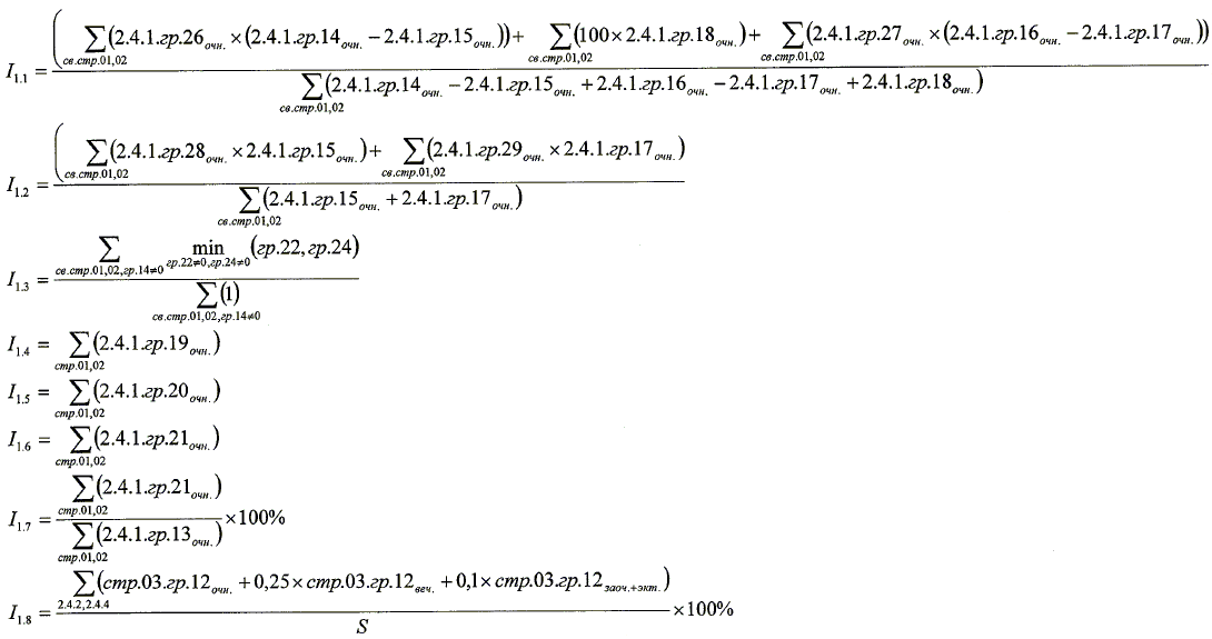 | I1.1 | Средний балл ЕГЭ студентов, принятых по результатам ЕГЭ на обучение по очной форме по программам бакалавриата и специалитета за счет средств соответствующих бюджетов бюджетной системы Российской Федерации | баллы | Вуз Филиал | Все | Отношение суммы средних баллов ЕГЭ студентов, принятых на обучение по очной форме обучения по результатам ЕГЭ или по результатам ЕГЭ и дополнительных испытаний за счет средств соответствующих бюджетов бюджетной системы Российской Федерации за исключением лиц, принятых по результатам целевого приема, по всем направлениям и специальностям программ бакалавриата и специалитета, умноженных на численность таких студентов, обучающихся по соответствующим направлениям и специальностям программ бакалавриата и специалитета, к суммарной численности таких студентов. |
