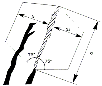 При оценке напряженности блоковых структур, имеющих морфологию тектонического шва, в форме сглаженной и плотно сомкнутой поверхности скважины бурятся с пересечением тектонического нарушения. При этом забой скважины в смежном блоке должен располагаться от плоскости тектонического нарушения на расстоянии не менее 15 м. При оценке напряженности блоковых структур, имеющих морфологию тектонического шва с зонами дробления, скважины бурятся без пересечения плоскости тектонического нарушения. При этом забои скважин в смежных блоках должны располагаться от плоскоскости тектонического нарушения на расстоянии не более 10 м. Величина показателя , определяется для каждой точки массива по формуле