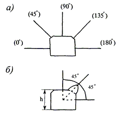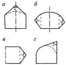 Рисунок 15 - Полигональная форма выработок при расположении мест разрушения: а - в кровле, б - в стенках, в - в забое выработки, г - в сопряжении кровли со стенкой, - угол разрушения поперечного сечения