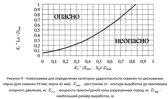 Категория удароопасности скважин по дискованию керна устанавливается по номограмме (рисунок 9) или расчетным методом.