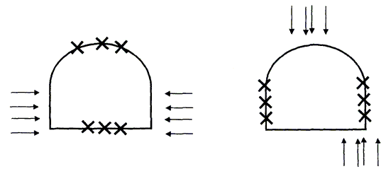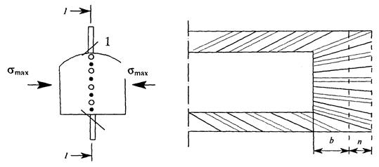По визуальным наблюдениям можно сравнивать степень напряженности отдельных конструктивных элементов системы разработки и ориентировочно определять величину и направление действия наибольших напряжений в нетронутом массиве пород. Ориентировка участков разрушения пород в сечении выработки относительно наибольших сжимающих напряжений изображена на рисунке 10.