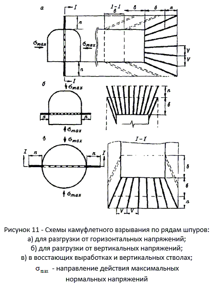 Камуфлетное взрывание с компенсационными шпурами и скважинами применяется для разгрузки краевых частей массива и целиков на участках, где требуется свести к минимуму вредное воздействие взрыва, а также для создания разгрузочных щелей. Компенсационные скважины и шпуры могут быть использованы и в предыдущих схемах, приведенных на рисунке 11.