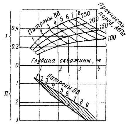 Рисунок 12 - Номограмма для определения параметров камуфлетного взрывания ряда шпуров (масса патронов ВВ 0,2 кг) I - относительная длина заряжаемой части скважины; II - расстояние до максимума напряжений, м