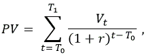 - значение величины, предусмотренной либо абзацем вторым, либо абзацем третьим, либо абзацем четвертым подпункта "а", либо подпунктом "б" пункта 2 настоящих Правил, в году t. В случае если осуществляется дисконтирование величины, указанной в абзаце четвертом подпункта "а" пункта 2 настоящих Правил, то