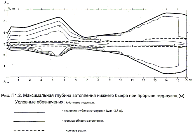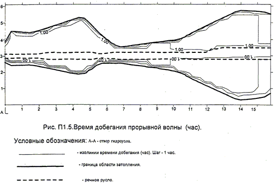 3.1.4. Результаты расчета по распространению волны прорыва ниже гидроузла следует нанести на топографическую карту вплоть до створа, в котором максимальный за время наводнения расход не превосходит расход обеспеченностью 5%. На карту должны быть нанесены граница области затопления, а также изолинии четырех характеристик прорывного паводка, используемых при определении вероятного вреда: максимальных за время аварии глубины и скорости, времени затопления местности после начала аварии СГТС и продолжительности затопления.