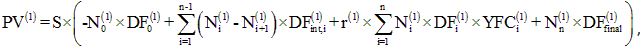 4.10.2. Если условия своп договора (контракта) предусматривают уплату денежных сумм, рассчитанных исходя из номинальной суммы, выраженной в первой валюте, и фиксированной ставки процента (в долях единицы) в первой валюте, дисконтированная стоимость платежей, осуществляемых в первой валюте, рассчитывается по следующей формуле: