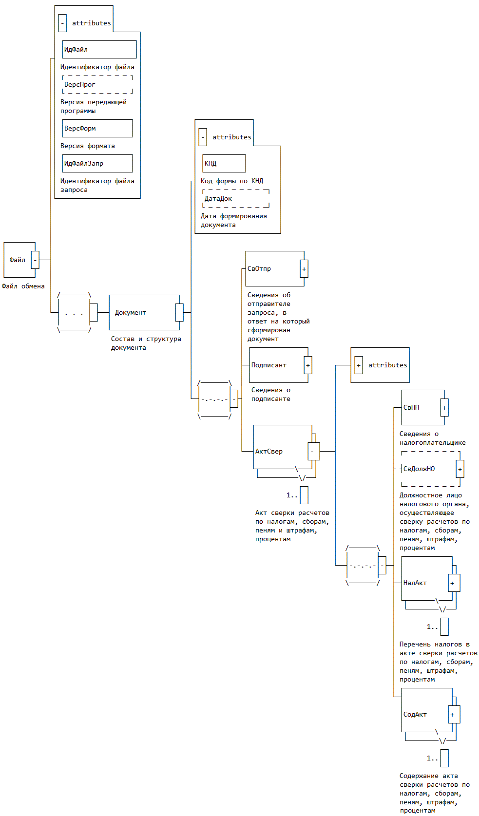 | Акт сверки расчетов по налогам, сборам, пеням, штрафам, процентам | АктСвер | С | | ОМ | Состав элемента представлен в табл. 4.5 |