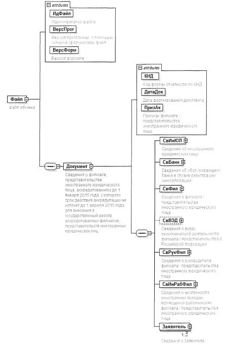 1. Настоящий формат описывает требования к XML файлам (далее - файлам обмена) передачи в электронном виде в налоговые органы органами органа (организации), осуществившего (ей) аккредитацию (принявшего решение об аккредитации) представительства иностранного юридического лица, сведений о представительстве иностранного юридического лица, осуществлявшем деятельность на основании разрешения на открытие представительства на территории Российской Федерации до 1 января 2015 года, у которого срок действия разрешения не истечет до 1 апреля 2015 года, для внесения в государственный реестр аккредитованных филиалов, представительств иностранных юридических лиц.