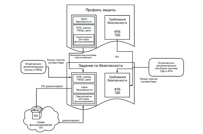 Строгое соответствие ориентировано на разработчиков ПЗ, которым требуются свидетельства, что требования ПЗ удовлетворены, что ЗБ является примером реализации ПЗ, хотя при этом ЗБ может быть более широким, чем ПЗ. По существу ЗБ определяет ОО, который выполняет, по крайней мере, что определено в ПЗ, и среду функционирования, которая выполняет как максимум что определено в ПЗ.