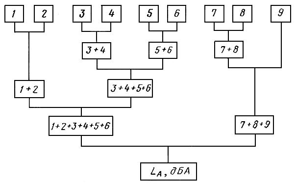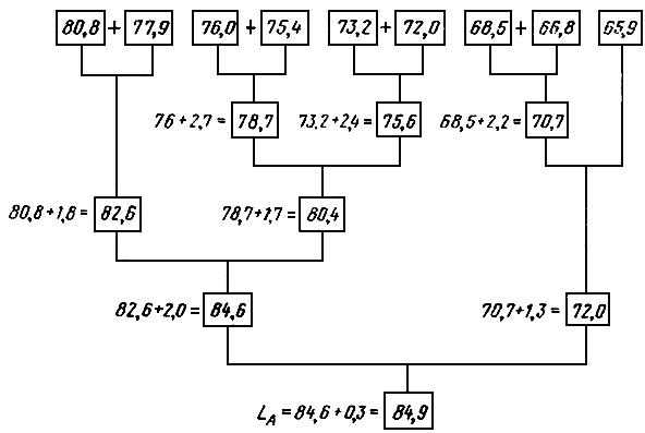 Располагаем скорректированные уровни звукового давления в порядке убывания и попарно их суммируют в соответствии со схемой, приведенной на черт.2.
