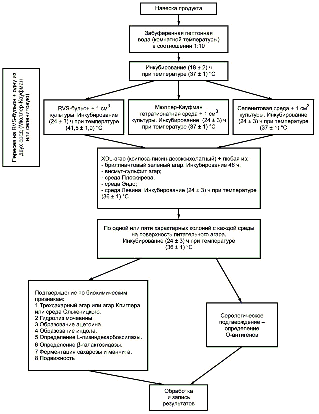 Метод выявления бактерий рода Salmonella в определенной массе или объеме продукта состоит из четырех этапов (см. 4.2; 4.3; 4.4; 4.5 и приложение А).
