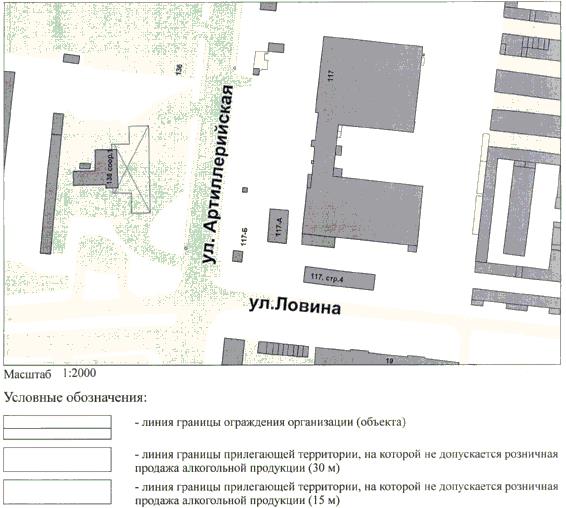 СХЕМА ГРАНИЦ ТЕРРИТОРИИ, НА КОТОРОЙ НЕ ДОПУСКАЕТСЯ РОЗНИЧНАЯ ПРОДАЖА АЛКОГОЛЬНОЙ ПРОДУКЦИИ, ПРИЛЕГАЮЩЕЙ К ООО МЕДИЦИНСКИЙ ДИАГНОСТИЧЕСКИЙ ЦЕНТР "ЛУЧ" ПО АДРЕСУ: Г. ЧЕЛЯБИНСК, ТРАКТОРОЗАВОДСКИЙ РАЙОН, УЛ. АРТИЛЛЕРИЙСКАЯ, Д. 117, ПОМЕЩЕНИЕ N 6, ЭТАЖ N 01