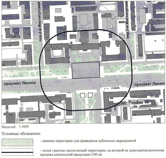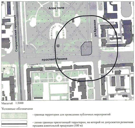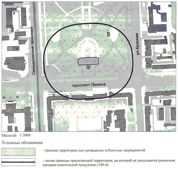 СХЕМА ГРАНИЦ ТЕРРИТОРИИ, НА КОТОРОЙ НЕ ДОПУСКАЕТСЯ РОЗНИЧНАЯ ПРОДАЖА АЛКОГОЛЬНОЙ ПРОДУКЦИИ, ПРИЛЕГАЮЩЕЙ К ПЛОЩАДКЕ НА АЛОМ ПОЛЕ, ПЕРЕКРЕСТОК СВЕРДЛОВСКОГО ПРОСПЕКТА И ПРОСПЕКТА ЛЕНИНА