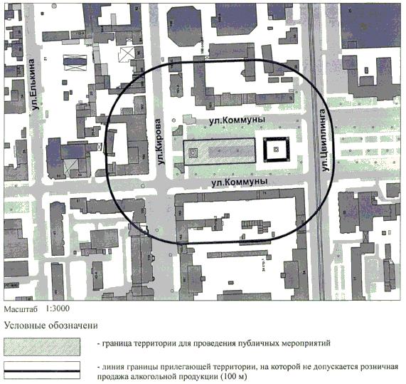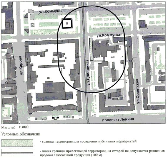 СХЕМА ГРАНИЦ ТЕРРИТОРИИ, НА КОТОРОЙ НЕ ДОПУСКАЕТСЯ РОЗНИЧНАЯ ПРОДАЖА АЛКОГОЛЬНОЙ ПРОДУКЦИИ, ПРИЛЕГАЮЩЕЙ К ПЛОЩАДКЕ У ПАМЯТНИКА ТАНКИСТУ НА КИРОВКЕ