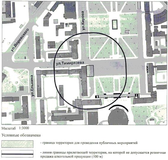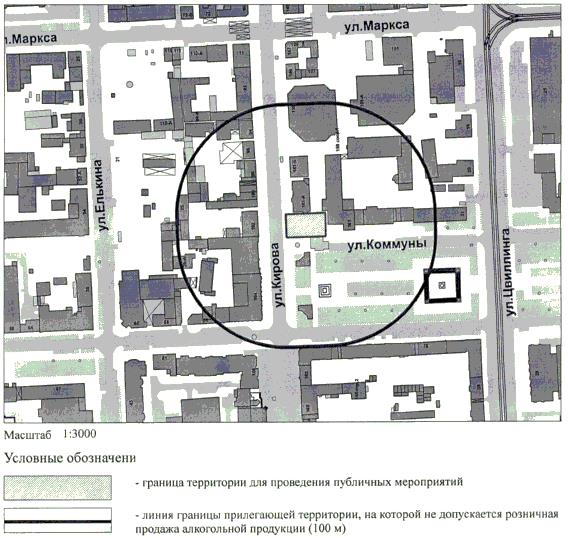СХЕМА ГРАНИЦ ТЕРРИТОРИИ, НА КОТОРОЙ НЕ ДОПУСКАЕТСЯ РОЗНИЧНАЯ ПРОДАЖА АЛКОГОЛЬНОЙ ПРОДУКЦИИ, ПРИЛЕГАЮЩЕЙ К ПЛОЩАДКЕ У ГЛАВПОЧТАМПТА НА КИРОВКЕ