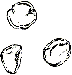 3.1.9 пыльцевые зерна белой акации: Пыльцевые зерна белой акации трехборозднопоровые, сплющенной формы, в очертании с полюса округлотреугольные с прямыми или слегка выпуклыми сторонами, с экватора сплющенно-эллиптические. Поры округлые или овальные, продольно вытянутые, на многих пыльцевых зернах поры слабо заметны. Текстура мелкопятнистая. Пыльца желтого цвета.