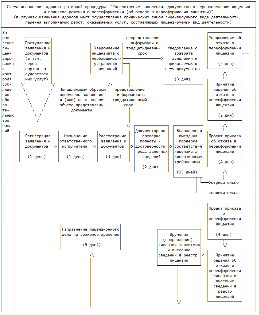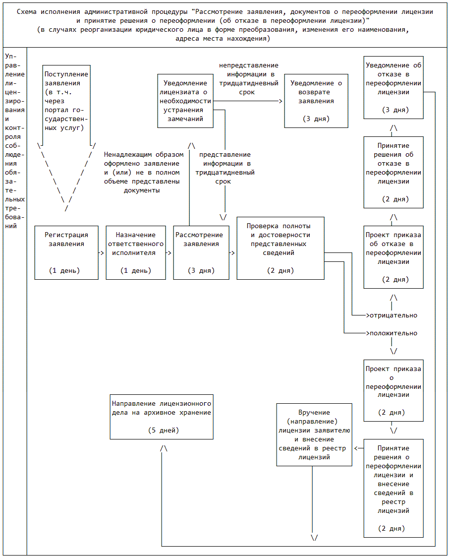 2) принятие решения о переоформлении (об отказе в переоформлении) лицензии (в случаях реорганизации юридического лица в форме преобразования, изменения его наименования, адреса места нахождения) - 10 рабочих дней со дня поступления в Росздравнадзор надлежащим образом оформленного заявления о переоформлении лицензии и других документов (сведений), предусмотренных пунктами 20 и 21 Административного регламента;