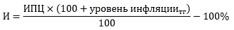 10. Уровень фактической инфляции предшествующего календарного года с учетом прогнозируемого уровня инфляции текущего года, установленного федеральным законом о федеральном бюджете на соответствующий финансовый год и плановый период (процентов) (И), определяется по формуле: