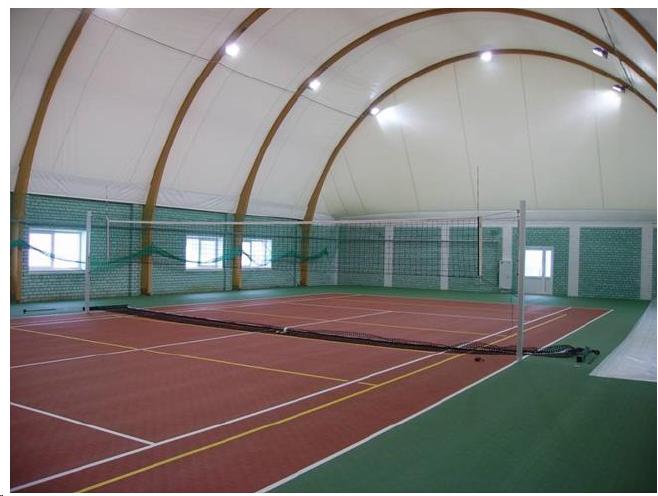 В настоящее время часто при строительстве спортивных сооружений из каркасно-тентовых конструкций применяются быстровозводимые конструкции из деревоклееных арок с двойной оболочкой. Это отличная альтернатива капитальным сооружениям, т.к. позволяет с высокой эффективностью реализовывать проекты по строительству спортивных сооружений различной направленности не только для образовательных организаций, но и для массового и профессионального спорта. Эти сооружения возможно возвести в короткие сроки (менее чем за 100 дней) с высоким качеством и допустимыми экономическими показателями.