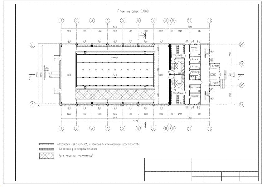 Планировочное решение для спортивного зала-трансформера 26 х 52 м со встроенным АБК, трибунами