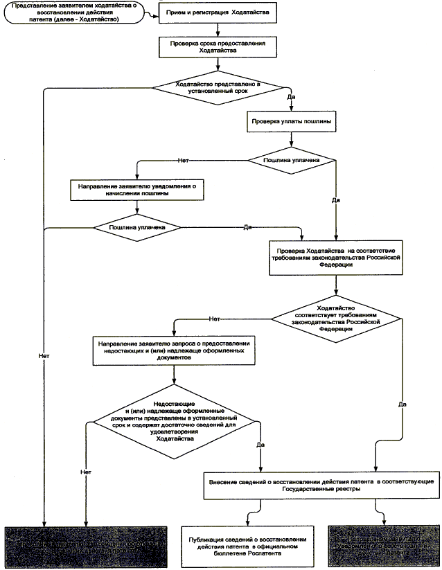 1) восстановление действия патента, внесение сведений о восстановлении действия патента в Государственный реестр изобретений Российской Федерации, в Государственный реестр полезных моделей Российской Федерации, в Государственный реестр промышленных образцов Российской Федерации (далее - Государственный реестр), публикация сведений о восстановлении действия патента в официальном бюллетене Роспатента и выдача (направление) заявителю уведомления о восстановлении действия патента и документа, содержащего сведения о восстановлении действия патента;