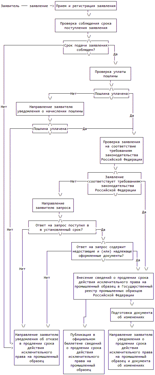 1) продление срока действия исключительного права на промышленный образец и удостоверяющего это право патента, внесение сведений о продлении срока действия исключительного права на промышленный образец и удостоверяющего это право патента в Государственный реестр промышленных образцов Российской Федерации (далее - Государственный реестр), публикация сведений о продлении срока действия исключительного права на промышленный образец и удостоверяющего это право патента в официальном бюллетене Роспатента "Промышленные образцы" (далее - официальный бюллетень) и выдача (направление) заявителю: