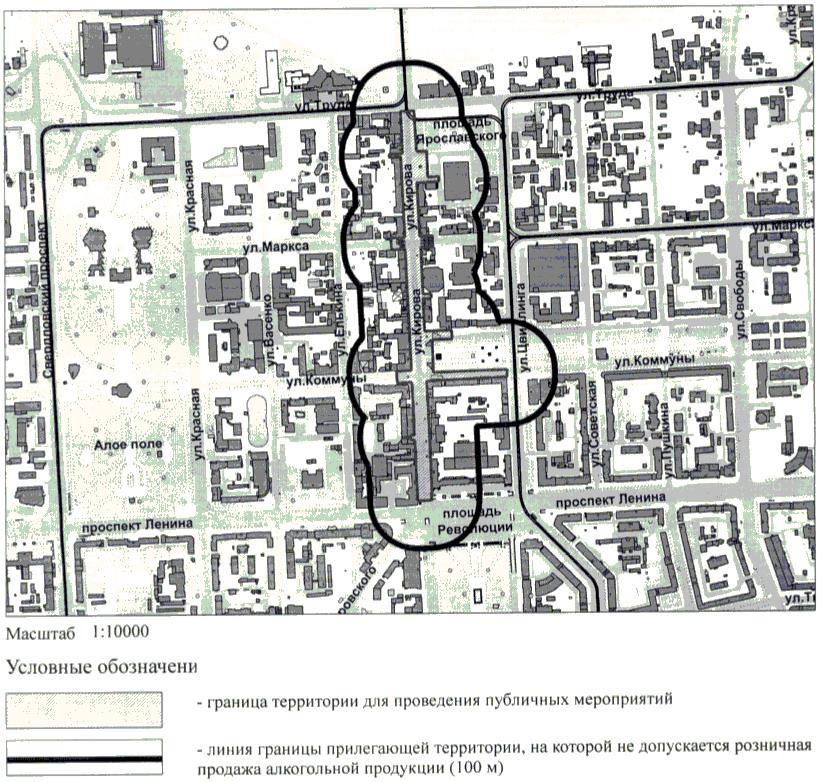 СХЕМА ГРАНИЦ ТЕРРИТОРИИ, НА КОТОРОЙ НЕ ДОПУСКАЕТСЯ РОЗНИЧНАЯ ПРОДАЖА АЛКОГОЛЬНОЙ ПРОДУКЦИИ, ПРИЛЕГАЮЩЕЙ К ТЕРРИТОРИИ ПЕШЕХОДНОЙ ЗОНЫ НА КИРОВКЕ