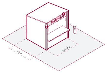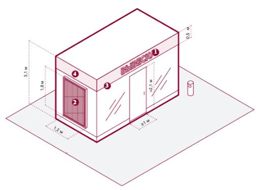 а) габариты торговой палатки: рекомендуемая глубина - 2,2 м, рекомендуемая ширина - 2,2 или 4,2 м, высота 3,1 м (рисунок 32);