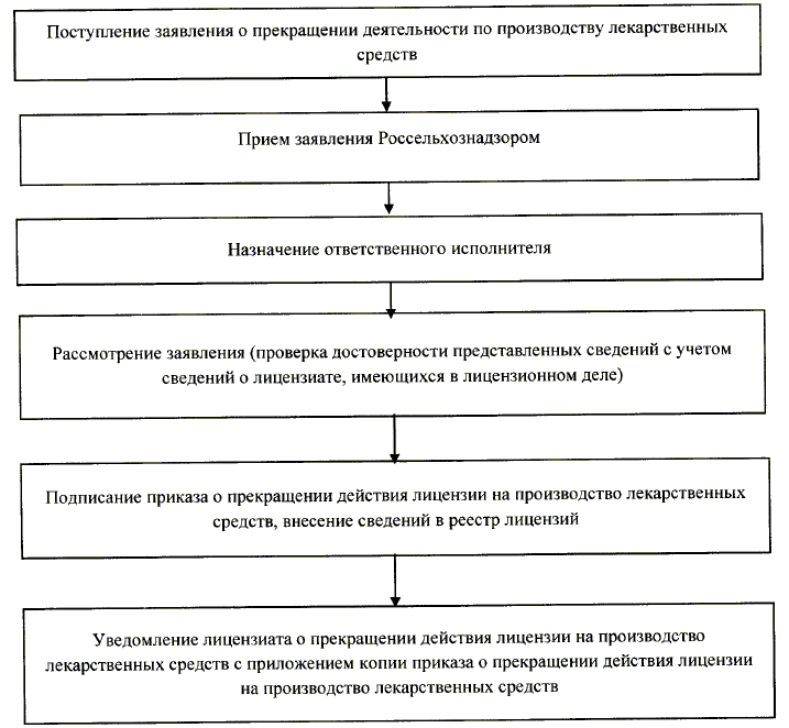 7) принятие решения о прекращении действия лицензии на основании поступления в соответствии с пунктом 20 Регламента заявления лицензиата о прекращении деятельности по производству лекарственных средств - десять рабочих дней со дня получения Россельхознадзором заявления о прекращении деятельности по производству лекарственных средств;
