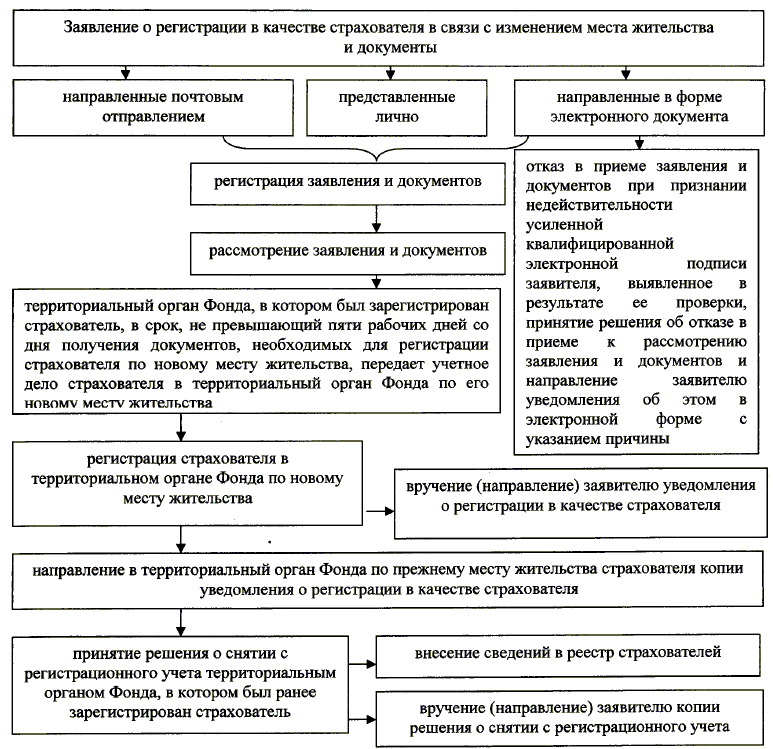 БЛОК-СХЕМА ПОСЛЕДОВАТЕЛЬНОСТИ АДМИНИСТРАТИВНЫХ ПРОЦЕДУР (ДЕЙСТВИЙ) ТЕРРИТОРИАЛЬНОГО ОРГАНА ФОНДА СОЦИАЛЬНОГО СТРАХОВАНИЯ РОССИЙСКОЙ ФЕДЕРАЦИИ ПО СНЯТИЮ С РЕГИСТРАЦИОННОГО УЧЕТА И РЕГИСТРАЦИИ В КАЧЕСТВЕ СТРАХОВАТЕЛЯ В СВЯЗИ С ИЗМЕНЕНИЕМ МЕСТА ЖИТЕЛЬСТВА СТРАХОВАТЕЛЯ