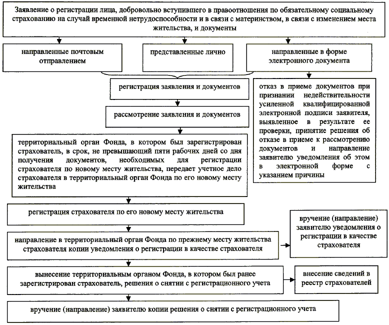 БЛОК-СХЕМА ПОСЛЕДОВАТЕЛЬНОСТИ ДЕЙСТВИЙ ТЕРРИТОРИАЛЬНОГО ОРГАНА ФОНДА СОЦИАЛЬНОГО СТРАХОВАНИЯ РОССИЙСКОЙ ФЕДЕРАЦИИ ПО РЕГИСТРАЦИИ (СНЯТИЮ С РЕГИСТРАЦИОННОГО УЧЕТА) СТРАХОВАТЕЛЕЙ В СВЯЗИ С ИЗМЕНЕНИЕМ МЕСТА ЖИТЕЛЬСТВА