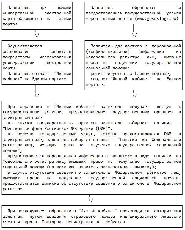Для предоставления государственной услуги в электронной форме в виде выписки из Федерального регистра лиц, имеющих право на получение государственной социальной помощи, через Единый портал необходимо внесение сведений из документов, определенных порядком регистрации на Едином портале.