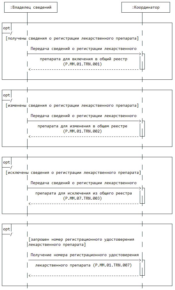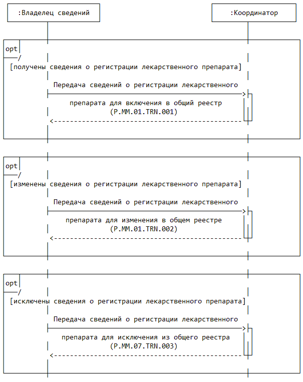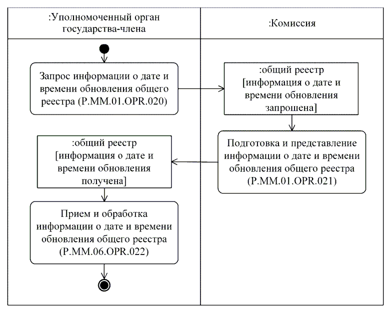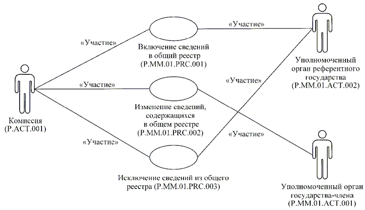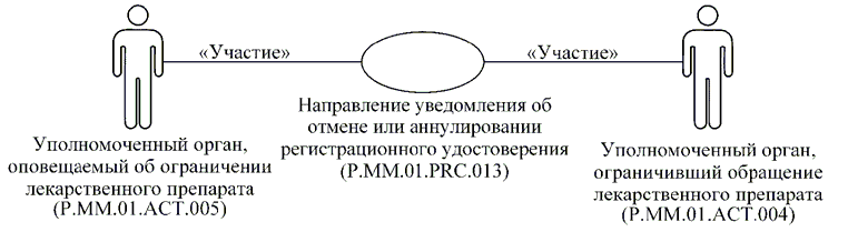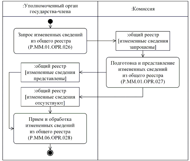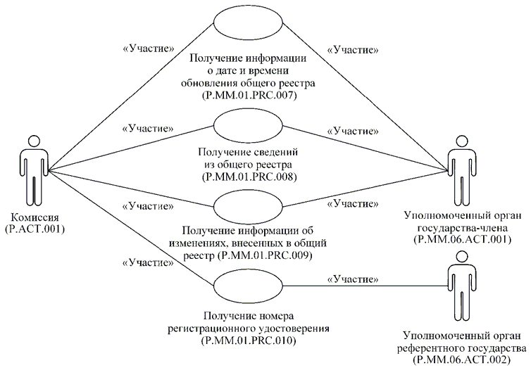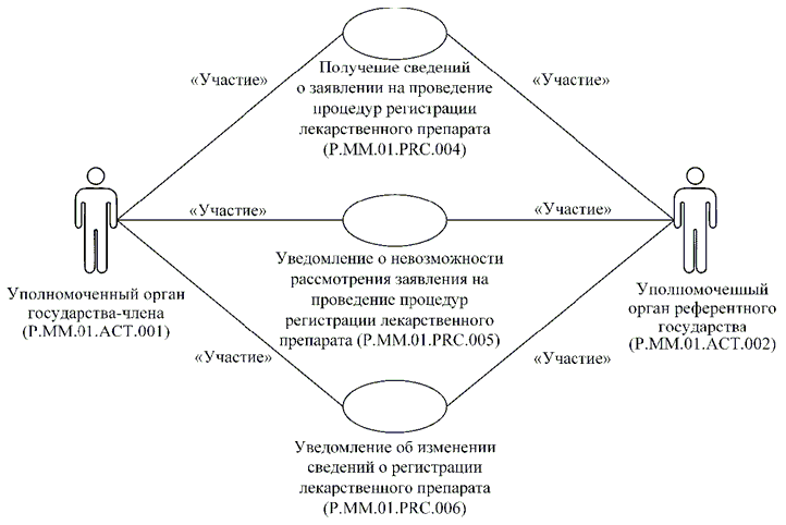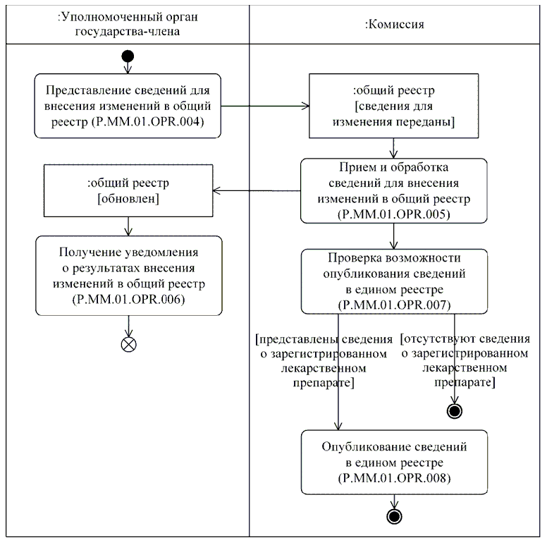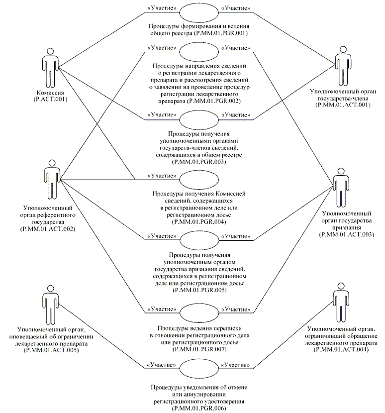 | P.MM.01.ACT.001 | уполномоченный орган государства-члена | уполномоченный на осуществление регистрации лекарственных препаратов орган государственной власти государства-члена или уполномоченная им организация, который представляет в Комиссию сведения о зарегистрированных лекарственных препаратах и сведения о заявлениях на проведение процедур, связанных с регистрацией и экспертизой лекарственных препаратов, для обновления общего реестра; получает от Комиссии по запросу сведения о регистрации лекарственных препаратов через интегрированную систему |