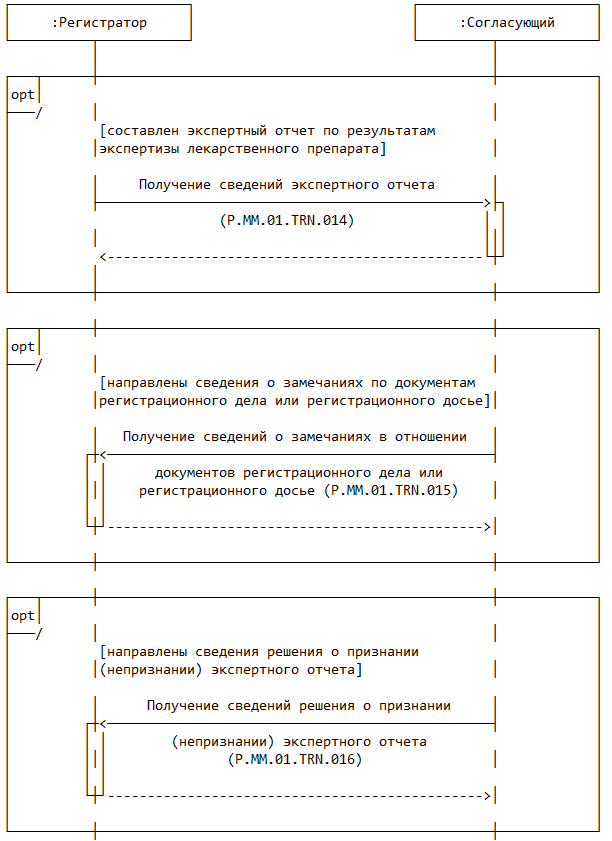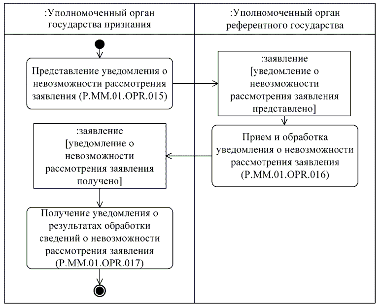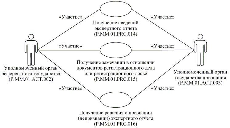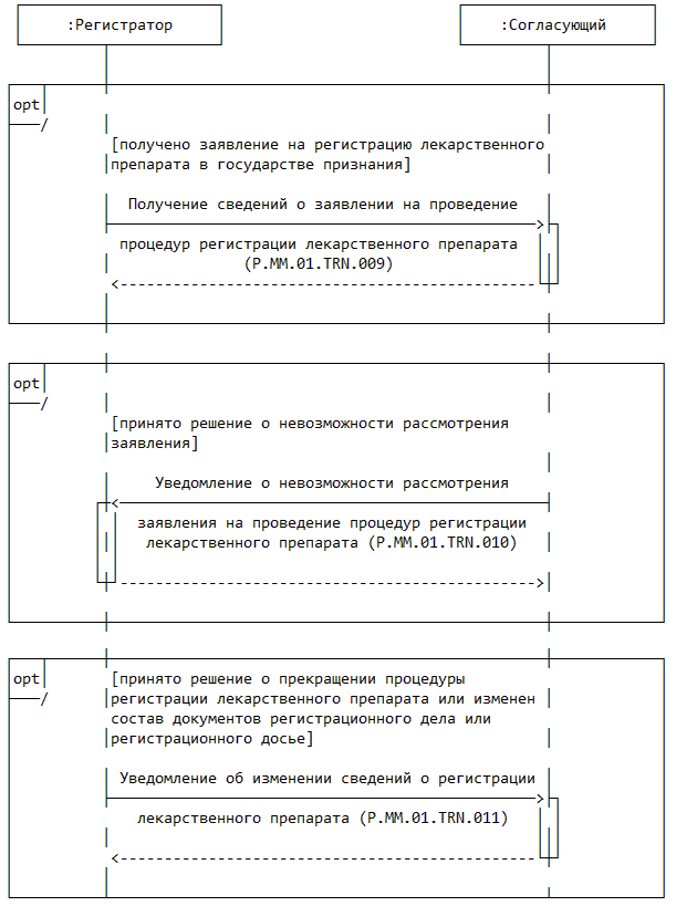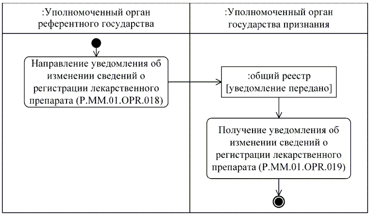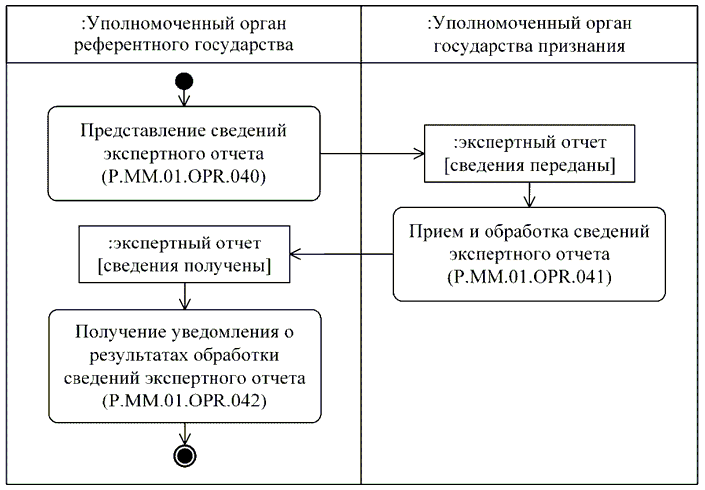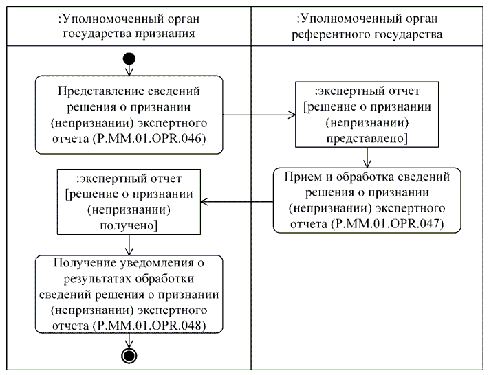 | P.MM.01.ACT.003 | уполномоченный орган государства признания | уполномоченный орган государства-члена, который осуществляет рассмотрение заявления на проведение процедур, связанных с регистрацией и экспертизой лекарственного препарата, получает уведомление об изменении сведений о регистрации лекарственного препарата, формирует и направляет в уполномоченный орган референтного государства уведомление о невозможности рассмотрения заявления на проведение процедур, связанных с регистрацией и экспертизой лекарственного препарата, получает по запросу документы регистрационного досье и регистрационного дела лекарственного препарата, проводит экспертизу лекарственного препарата с использованием материалов регистрационного дела и (или) регистрационного досье, осуществляет рассмотрение экспертного отчета об оценке безопасности, эффективности и качества, представляет решение о признании (непризнании) экспертного отчета или замечания в отношении экспертного отчета об оценке безопасности, эффективности и качества |