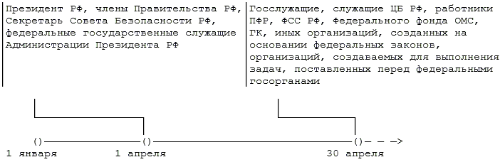 1) не позднее 1 апреля года, следующего за отчетным (Президент Российской Федерации, члены Правительства Российской Федерации, Секретарь Совета Безопасности Российской Федерации, федеральные государственные служащие Администрации Президента Российской Федерации);