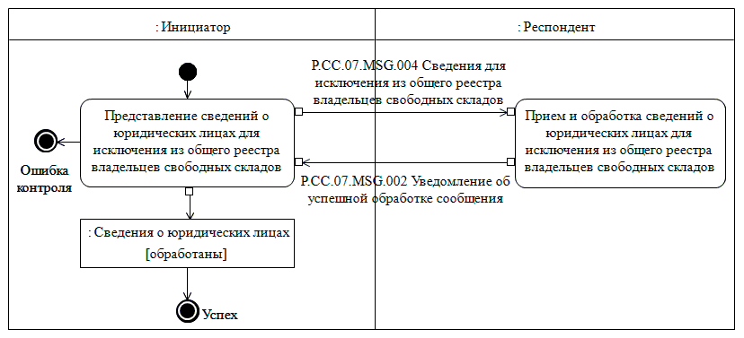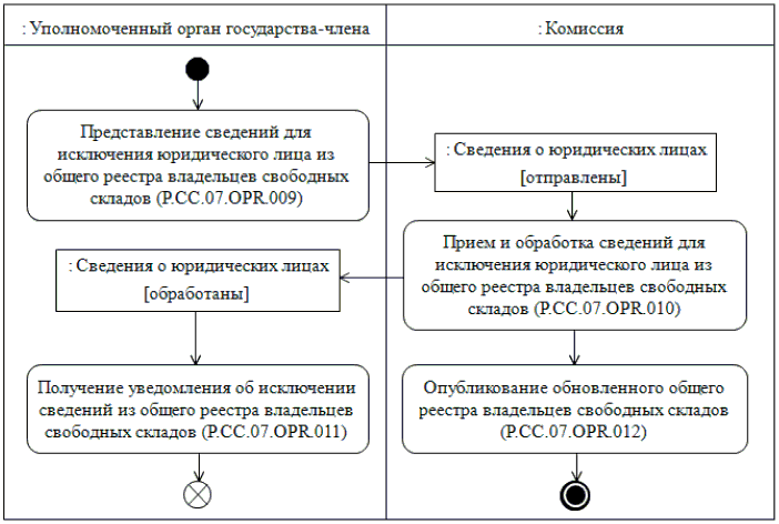 При исключении сведений о юридических лицах из национального реестра выполняется процедура "Исключение сведений о юридических лицах из общего реестра владельцев свободных складов" (P.CC.07.PRC.003).