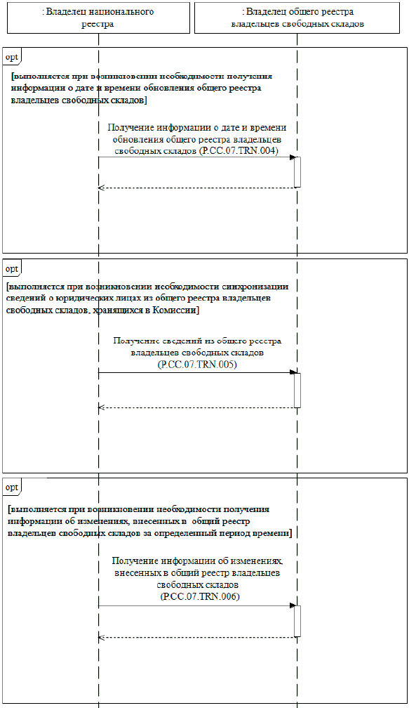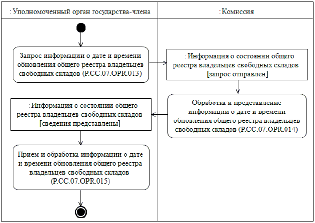 Запрос на представление информации о дате и времени обновления общего реестра владельцев свободных складов выполняется уполномоченным органом государства-члена в целях оценки необходимости синхронизации хранящихся в информационной системе уполномоченного органа государства-члена сведений о юридических лицах, включенных в общий реестр владельцев свободных складов, со сведениями о юридических лицах, содержащимися в общем реестре владельцев свободных складов, хранящимися в Комиссии. При осуществлении запроса на представление информации о дате и времени обновления общего реестра владельцев свободных складов выполняется процедура "Получение информации о дате и времени обновления общего реестра владельцев свободных складов" (P.CC.07.PRC.004).
