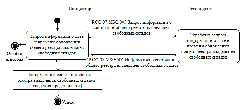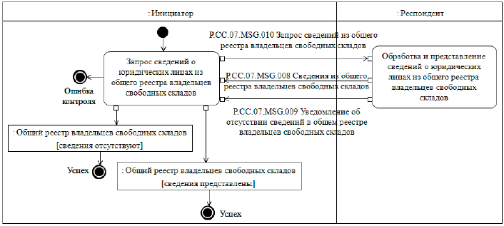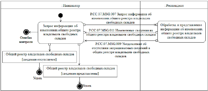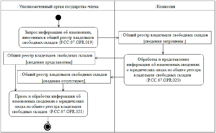 При запросе информации об изменениях, внесенных в общий реестр владельцев свободных складов, представляются сведения о юридических лицах, которые были добавлены в общий реестр владельцев свободных складов или в которые были внесены изменения начиная с момента, указанного в запросе, до момента выполнения этого запроса. При осуществлении запроса на представление информации об изменениях, внесенных в общий реестр владельцев свободных складов, выполняется процедура "Получение информации об изменениях, внесенных в общий реестр владельцев свободных складов" (P.CC.07.PRC.006).