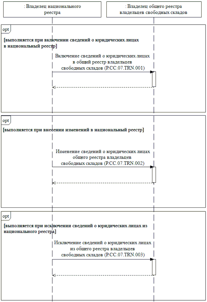 При включении сведений о юридических лицах в национальный реестр выполняется процедура "Включение сведений о юридических лицах в общий реестр владельцев свободных складов" (P.CC.07.PRC.001).