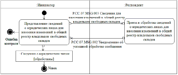 В случае если в процессе внесения изменений в национальный реестр изменяется регистрационный номер документа, подтверждающего включение сведений о юридических лицах в национальный реестр, то представление сведений о юридических лицах осуществляется с использованием 2 процедур: "Исключение сведений о юридических лицах из общего реестра владельцев свободных складов" (P.CC.07.PRC.003) и "Включение сведений о юридических лицах в общий реестр владельцев свободных складов" (P.CC.07.PRC.001).